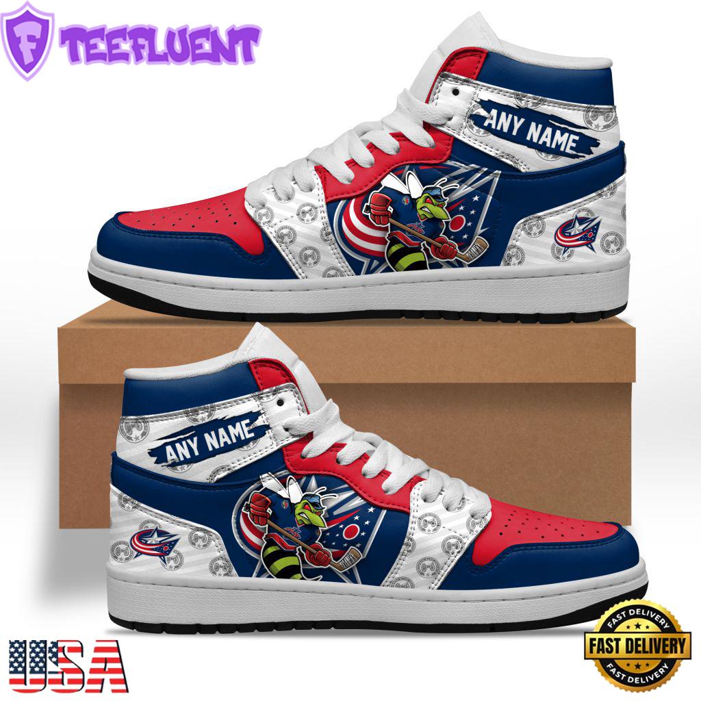 Custom Name NHL Columbus Blue Jackets Team Mascot Design Air Jordan 1 Hightop Shoes Sneakers , NHL Shoes Sneakers For Mens