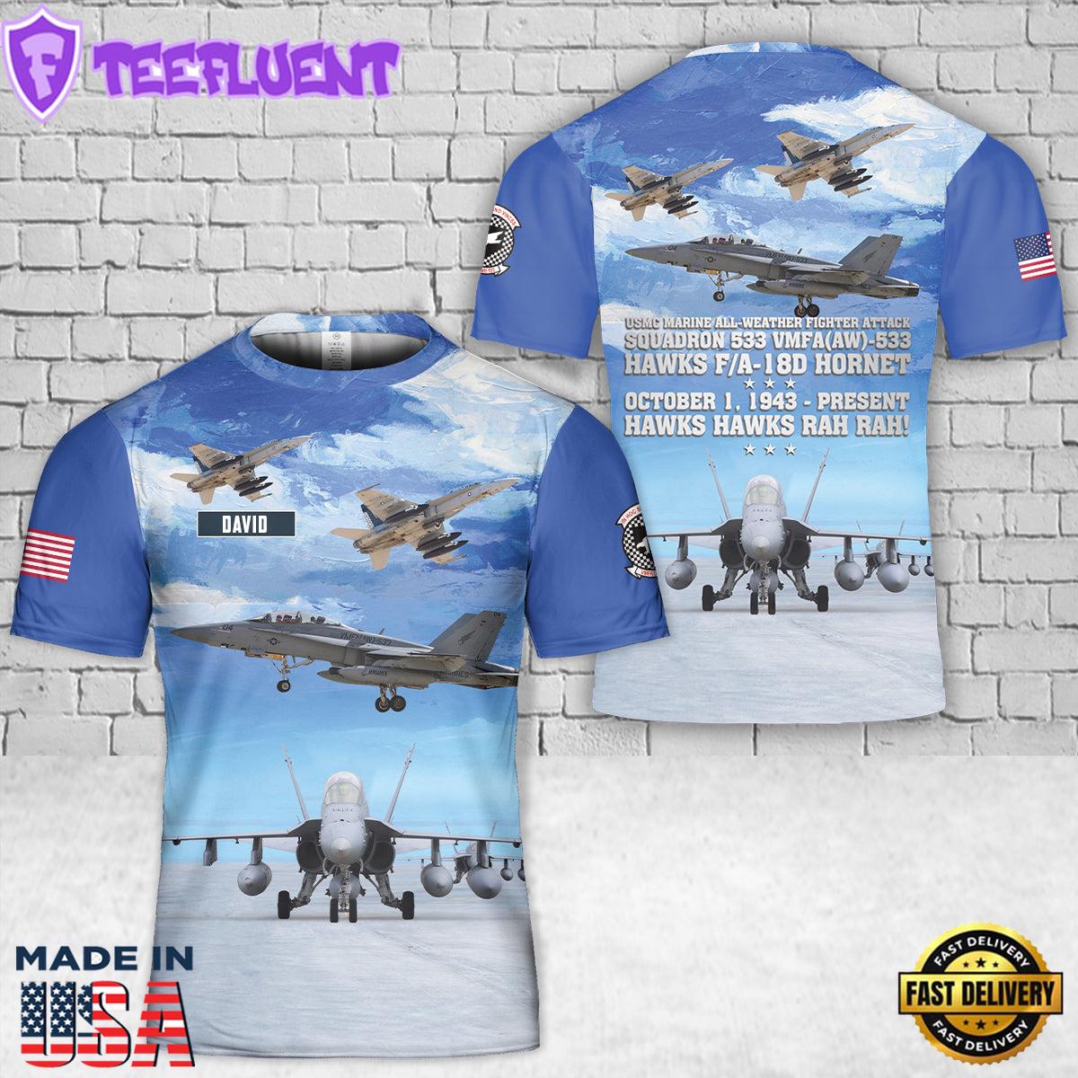 Custom Name USMC Marine All-Weather Fighter Attack Squadron 533 VMFA(AW)-533 Hawks FA-18D Hornet 3D T-Shirt For Man