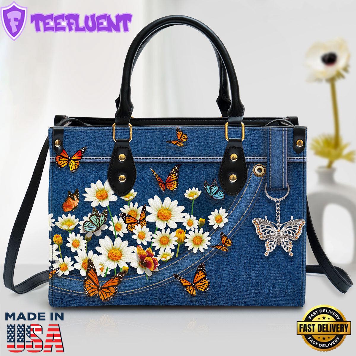 Daisy And Butterfly Leather Handbag Christ Gifts Leather Bags The leather handbag is a timeless accessory that exudes elegance and sophistication. Crafted from high-quality, supple leather, it features a smooth finish that enhances its luxurious appeal. With a spacious interior, it offers ample room for essentials like a wallet, phone, and makeup. The handbag is often adorned with meticulous stitching and subtle hardware details, adding a touch of charm. Its versatile design allows it to transition seamlessly from casual outings to formal events, making it a staple in any wardrobe. Whether carried by hand or slung over the shoulder, this leather handbag is both a practical choice and a statement piece.