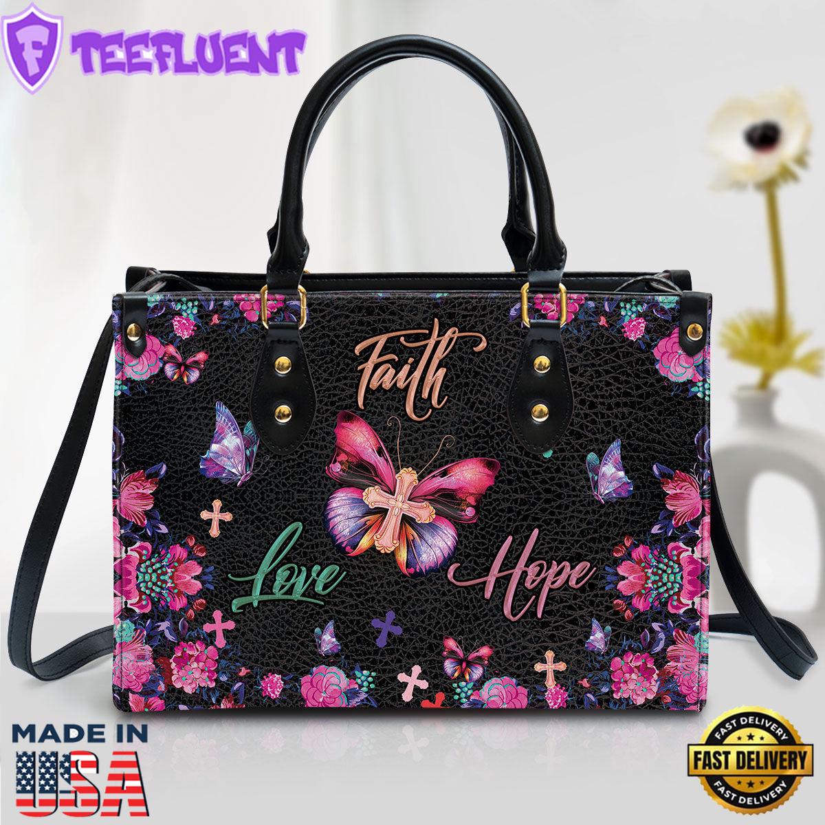 Flower Leather Handbag Faith Hope Love Leather Bag Christ Gifts Leather Bags The leather handbag is a timeless accessory that exudes elegance and sophistication. Crafted from high-quality, supple leather, it features a smooth finish that enhances its luxurious appeal. With a spacious interior, it offers ample room for essentials like a wallet, phone, and makeup. The handbag is often adorned with meticulous stitching and subtle hardware details, adding a touch of charm. Its versatile design allows it to transition seamlessly from casual outings to formal events, making it a staple in any wardrobe. Whether carried by hand or slung over the shoulder, this leather handbag is both a practical choice and a statement piece.