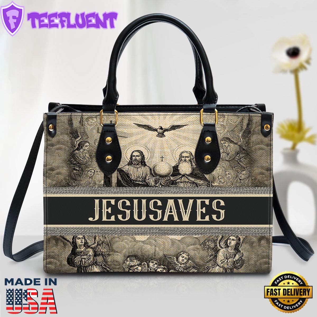 Jesus Saves Leather Handbag Christ Gifts Leather Bags The leather handbag is a timeless accessory that exudes elegance and sophistication. Crafted from high-quality, supple leather, it features a smooth finish that enhances its luxurious appeal. With a spacious interior, it offers ample room for essentials like a wallet, phone, and makeup. The handbag is often adorned with meticulous stitching and subtle hardware details, adding a touch of charm. Its versatile design allows it to transition seamlessly from casual outings to formal events, making it a staple in any wardrobe. Whether carried by hand or slung over the shoulder, this leather handbag is both a practical choice and a statement piece.