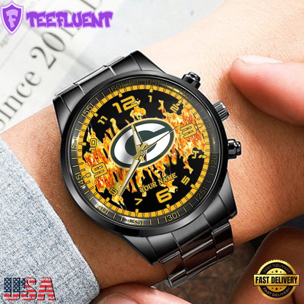 NFL Custom Name Green Bay Packers 3D Men Black Stainless Steel Watch