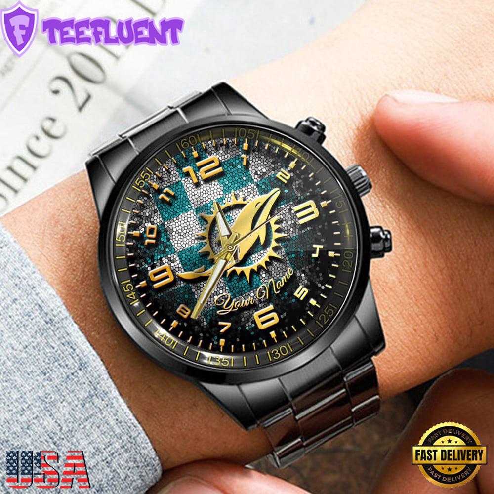 Photos Of NFL Custom Name Miami Dolphins 3D Men Black Stainless Steel Watch