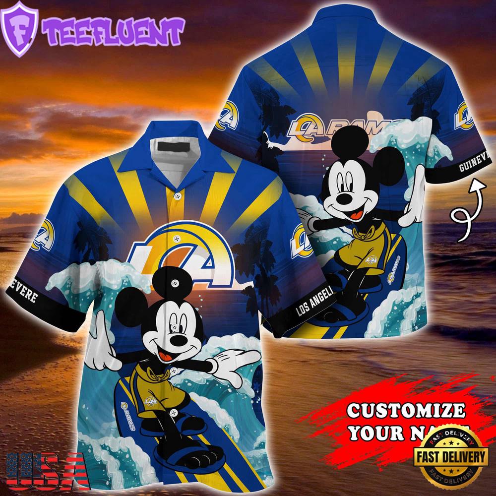Photos Of NFL Los Angeles Rams Mickey Mouse Surfing Custom Name Summer Hawaiian Shirt