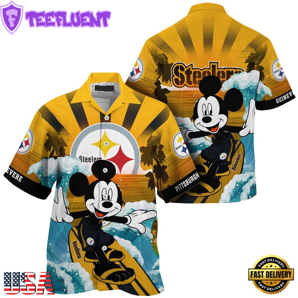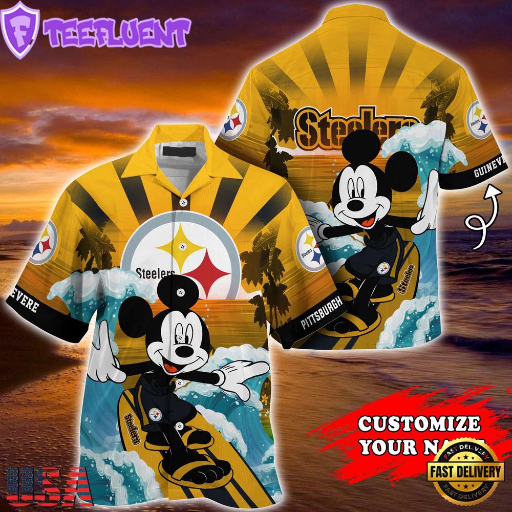 Photos Of NFL Pittsburgh Steelers Mickey Mouse Surfing Custom Name Summer Hawaiian Shirt