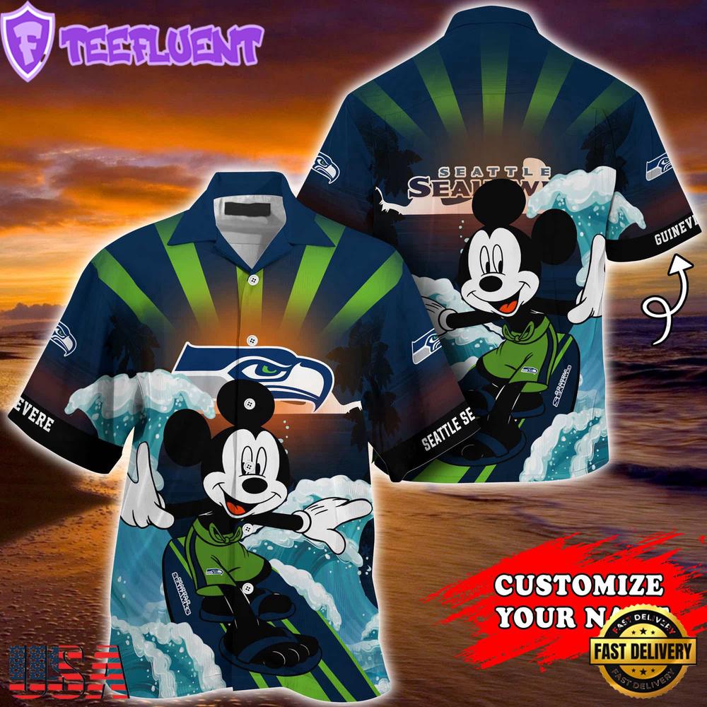 Photos Of NFL Seattle Seahawks Mickey Mouse Surfing Custom Name Summer Hawaiian Shirt