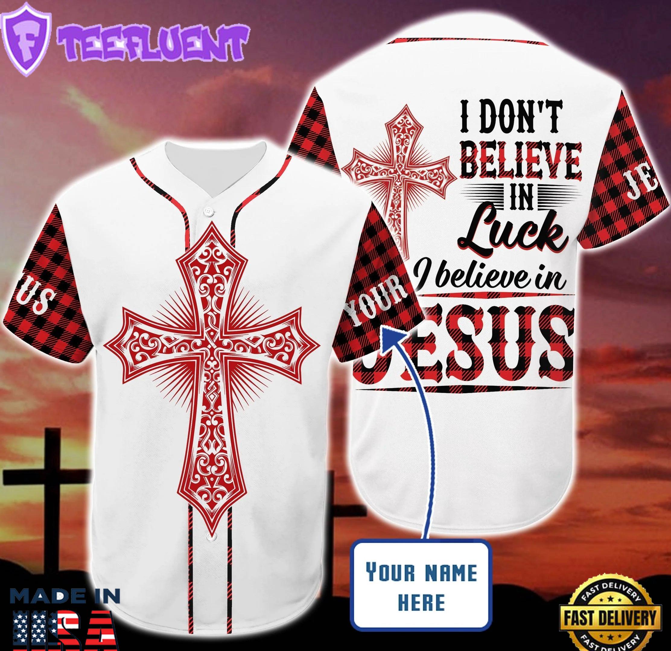 Red Cross I Dont Believe In Luck I Believe In Jesus Custom Baseball Jersey Christian Baseball Jersey