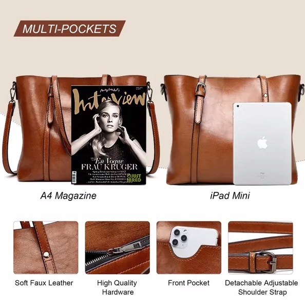 - The multi-pocket design makes it easy to keep your keys, smartphone, cosmetics, wallet, sunglasses, Ipad, magazines and other items neat and organized, even with a large leather tote.