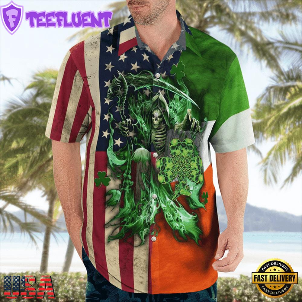 St. Patrick’S Day Irish Grim Reaper Irish Flag And American Flag Hawaii Shirt , Vintage Hawaiian Shirts