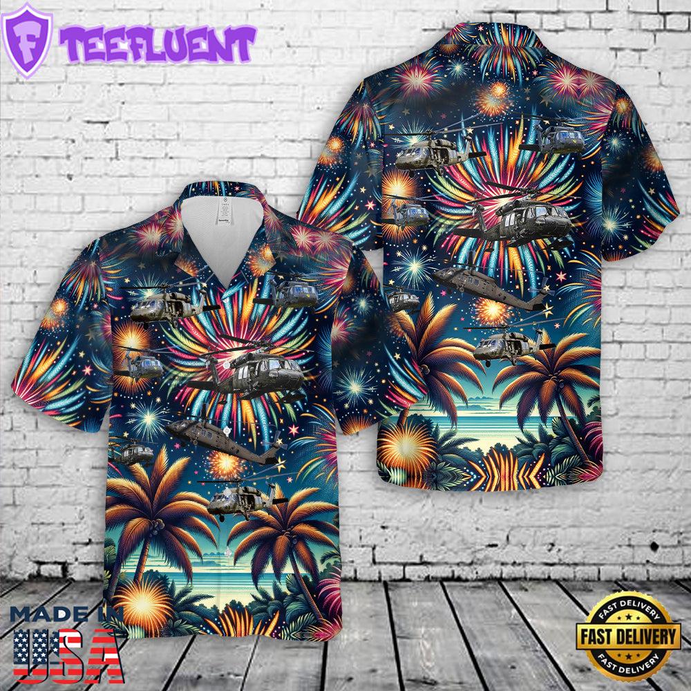 Photos Of US Army Hawaiian Shirt, US Army Sikorsky UH-60 Black Hawk With Palm Tree And Firework Hawaiian Shirt