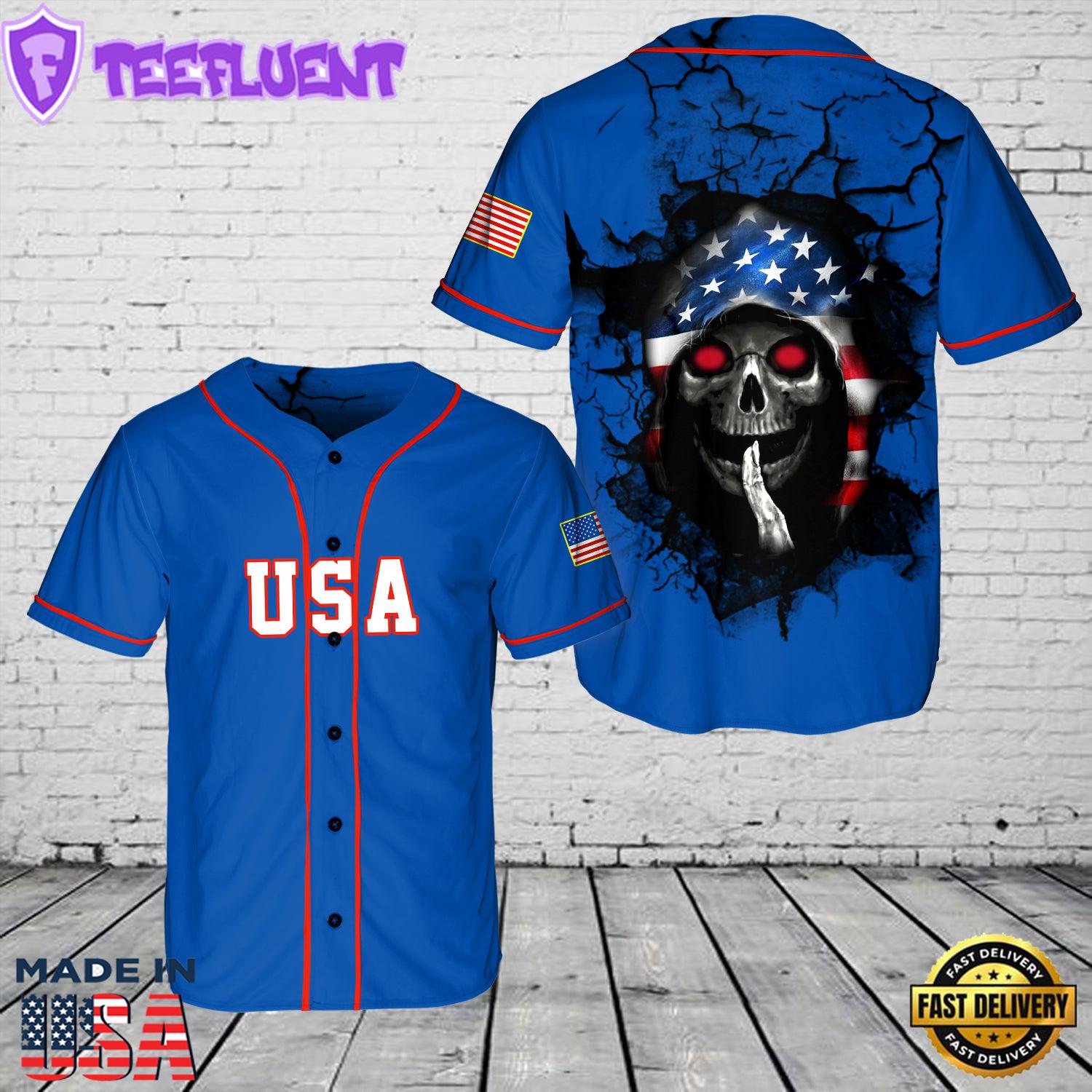 - American Flag Grim Reaper Shh Red Eyes Skull Baseball Jersey For Man And Women