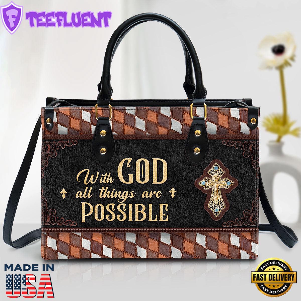 With God All Things Are Possible Cross Leather Handbag Christ Gifts Leather Bags The leather handbag is a timeless accessory that exudes elegance and sophistication. Crafted from high-quality, supple leather, it features a smooth finish that enhances its luxurious appeal. With a spacious interior, it offers ample room for essentials like a wallet, phone, and makeup. The handbag is often adorned with meticulous stitching and subtle hardware details, adding a touch of charm. Its versatile design allows it to transition seamlessly from casual outings to formal events, making it a staple in any wardrobe. Whether carried by hand or slung over the shoulder, this leather handbag is both a practical choice and a statement piece.
